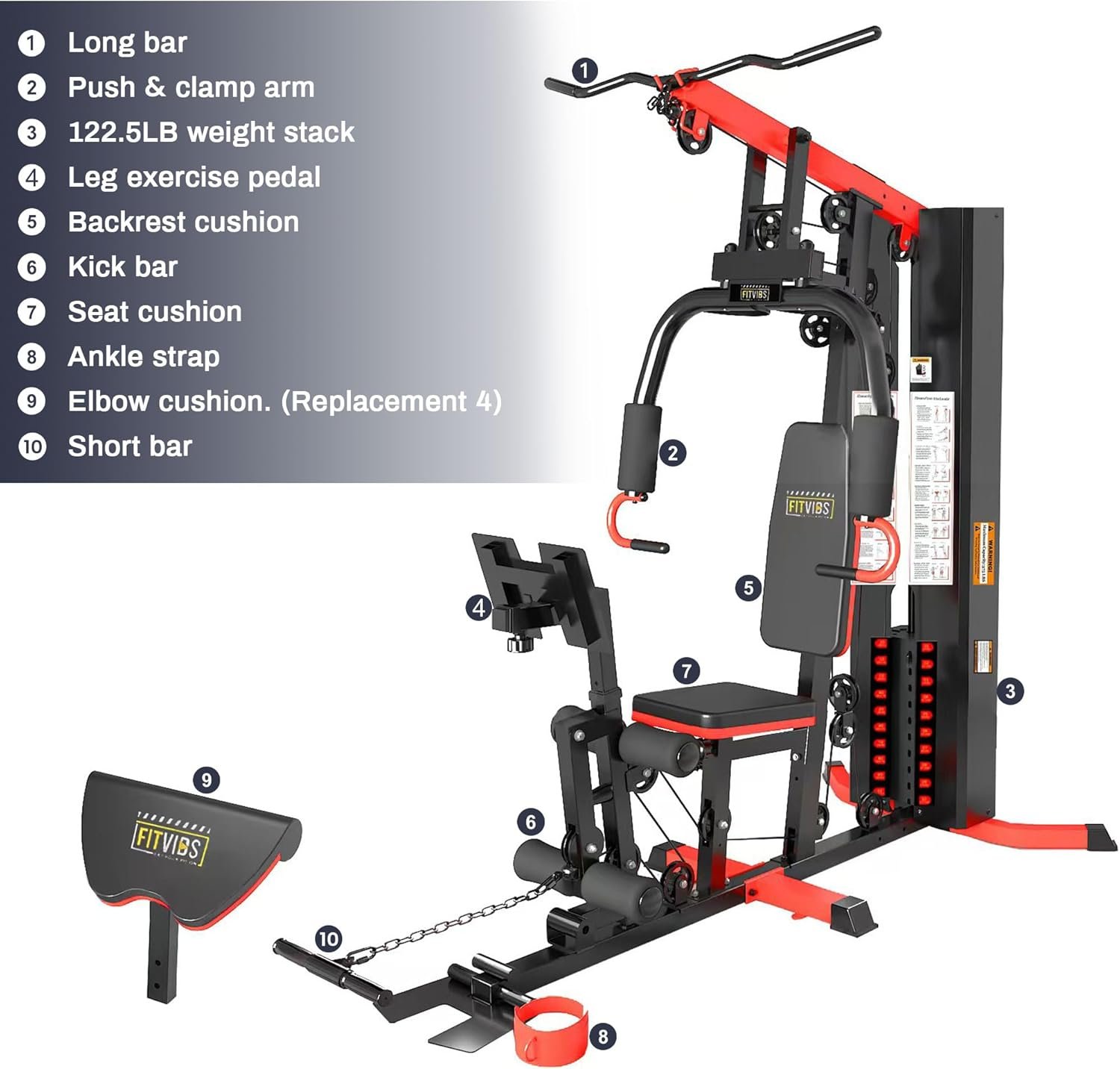 - Space-Saving: Exercise equipment size of 42″x 76″x 80″, Train hard without sacrificing living areas and help achieve muscle-building effects. Fitvids compact home gym fits apartments, garages, and basements. Soft seat cushion provides comfort for every movement