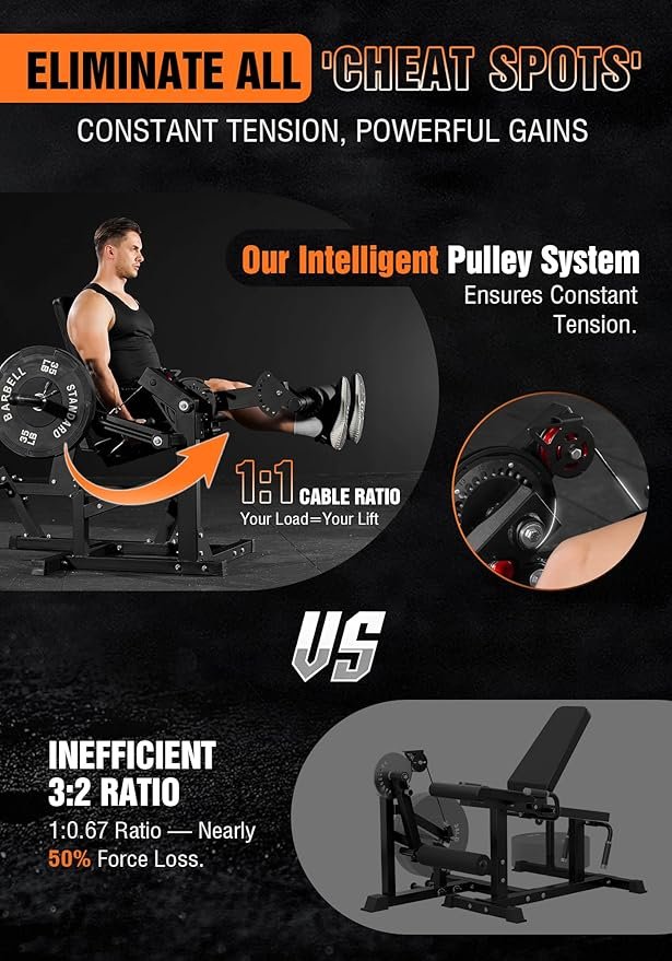 - True Constant-Tension Cable System: Aircraft-grade aluminum pulleys ensure buttery-smooth motion and constant muscle tension throughout every rep—unlike traditional gravity-limited leg extension machine that lose resistance. With a true 1:1 cable ratio, the weight you lift is the weight you load, enabling precise tracking and effortless changes. Perfect for shared workouts and relentless gains.